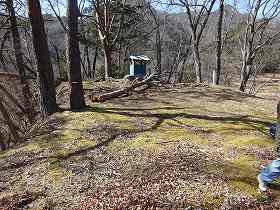 東側の帯曲輪からさらに比高10mほど登って行くと、今度はもっとちゃんと削平された腰曲輪があり、東側の先端部との間が堀切になっているのが見えてくる。ここからさらに10mほど登ったところが1郭である。1郭は長軸15mほどの郭であり、あまり広くはない。城というよりは物見の砦といった程度のものである。削平もきちんとされてはおらず、低い段差で3段に分かれている。この1番高いところに祠が祭られていた。