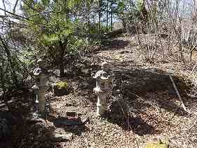 堀切の東側には尾根が長く続いていて、そこに数段の郭が造成されている。東側の最もピークの部分には祠が祭られていた。その東側の下には灯篭や石段まで設置されている。またその脇にも神社が設置されているようなのだが、それを覆っている外側の建物が倒壊しかけていた。それにしてもこの狭い山頂上に3つもの神社が祭られているとは、かなり信仰を集めていた山であったことが分かる。