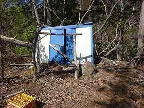 | その下にある神社は崩壊しつつある。 | さらに尾根の先の郭。なぜか洗濯機が捨てられている。これを持って上がるのは、並大抵の苦労ではなかったであろう。 |