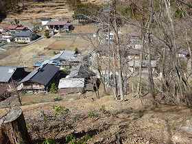 | 1郭下の腰曲輪から見下ろした尾附の集落。 | その先にある西側の堀切。 |