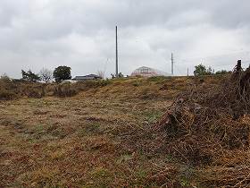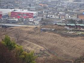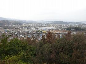 | 城内に設置された展望台から、西側山麓を遠望したところ。小幡の城下町である。 | 東側城塁の北側部分。切岸加工したために平場が造成されている。 |