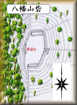 八幡山は、比較的傾斜の緩やかな山であったようで、山頂部の砦を城郭として成立させるために、周囲を切岸加工している。西側はもともと急斜面だったようで、特に加工を必要としなかったようであるが、北側、東側、南側の三方向は、この切岸加工によって、腰曲輪状の平場が生じている。切岸の高さは6mほどである。また、南側の下は堀切状になっている。