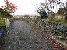 この笠塔婆の南側が石積みの土手となっており、なんとなく堀状の地形をしている。