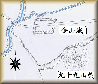 九十九山の北西側200mほどの集落が金山城の跡であったという。城は2つの河川が合流する地点に位置しており、北側と西側は、この2本の河川が、天然の堀となっていたようである。