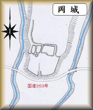 岡城は、珊瑚寺の西側300mほどのところにある比高10mほどの台地先端部にあった。両側に河川が流れている台地で、北側の台地続きの部分を区画すれば簡単に城域が確保できる地形となっている。