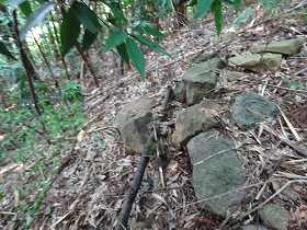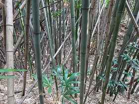 | 西側の城塁縁には石積みが見られる。 | 南側の堀切の跡。深さ3m、幅6mほどもあるのだが、竹が密集していて、写真ではよく分からない。 |