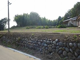 | 折れのある土塁には、比較的大きめの石がゴロゴロとしている。もともとは石垣造りであったのだろうか。 | 東側の道路沿いの土手。この石垣は後世のものであろうか。 |