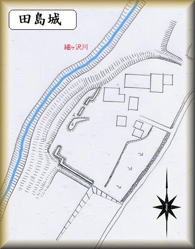 田島168番地のお宅のある一帯が田島城の跡である。西側の小川に臨む段丘地形なので、南北と東側の街道に沿う部分を区画すれば城郭として成立する。しかし城内は、宅地化や耕作に伴う改変が進んでおり、一見したところ、遺構は隠滅しているように思える。
