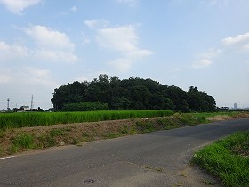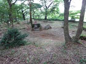 山頂は古墳になっており、古墳の案内板も設置されていた。登ってみると分かるが、山頂は前方後円墳となっていた。ということで、たいしたスペースはないのだが、東側に一段下ったところにまとまった平場がある、兵士を駐屯させるとすれば、この場所であろう。ここには祠が祭られており、そのためか、縁に土塁状の高まりも見られる。、ただいいずれにせよ、たいした広さはないので、多数の兵士を配置することはおぼつかない。