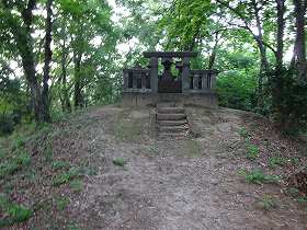 | 山頂の古墳の北東側には、低い土塁で囲まれた一角がある。 | 山頂の前方後円墳上に祭られた祠。 |