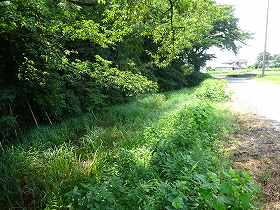 南半分の遺構は湮滅してしまったようだが、東側のラインは、堀や土塁こそ残していないものの、高さ1mほどの土手が南北に延びていて、かつてのラインを推し量ることはできる。