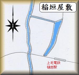 稲垣屋敷は上毛電鉄樋越駅のすぐ北西側にあった。西側に川が流れ、東側には池があるという好立地にある。北側の区画は今回は確認してはいないが、水路があって城域を区画しているようである。