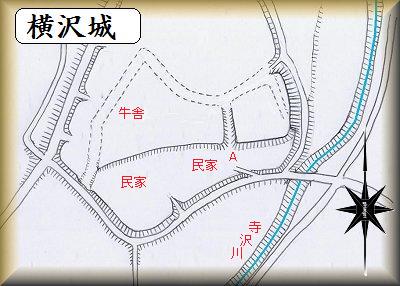 横沢城は、前橋市役所大胡清掃工場の東500mほどのところにある。寺沢川に臨む比高8mほどの微高地上である。北側から南側に向かって突き出した舌状台地の形状をしており、北側の台地続きの部分を区画することによって、城郭としての独立性を維持している。