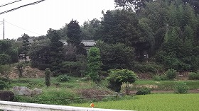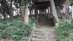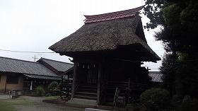 | 西側の道路沿いの堀と土塁。道路のためにだいぶ埋められているようだが、もともとはきちんとした堀であったと思われる。 | 境内にあった藁葺きの建物。こういう建物が好きなので紹介しておく。 |