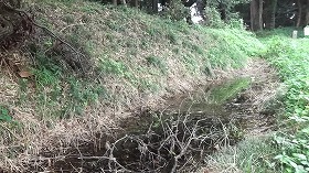 | 本堂の西側にある内堀。 | 東の虎口脇の堀。湧水点になっている。 |