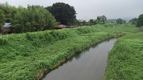 城の西側には荒砥川が流れ、天然の水堀となっている。こちらの川に面する部分も切岸城の土手となっており、防御を固めている。こちらもまた城郭的な風景である。