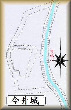 今井城は、荒砥川の西側に築かれていた。川を要害として、水堀を廻らせた城館であったと思われる。川を渡る橋の脇に小さな公園があって、そこに城址標柱が立てられている。