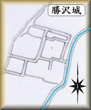 勝沢城は堀を組み合わせて数郭を配置した城郭であったらしいが、城址は見事に宅地化されていて、現在では遺構らしきものは見受けられない。造成はかなり早い時代に行われたようで、古い航空写真を見ても、旧状はさっぱり理解できない。そこで山崎一氏の図と古い航空写真を基にして想像図を描いてみた。