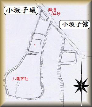 小坂子城は、県道34合繊の南側、南端に八幡神社の祭られている微高地に築かれていた。また、谷戸を挟んで東側150mほどの所には小坂子館があった。