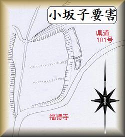 小坂子要害は、小坂子町交差点の北東300m、福徳寺の北側の比高10mほどの微高地に築かれていた。