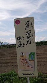 力丸地区の善昌寺の北東側が力丸城の本丸跡であり、ナビの地図には「力丸古城」と掲載されていた。現在ここには城址碑が建てられているので、かろうじて城址であることを主張してはいるが、明確な遺構はほぼ失われてしまっている。城址碑の脇には、『「力丸」「宿阿内」城の跡』、と書かれた案内板が立てられていて、この地域では力丸城と宿阿内城が、代表的な城郭として地元で認識されているらしいことが分かる。