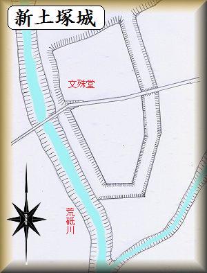 城内の中央西部付近が一段高くなっており、そこには文殊堂が置かれている。この辺りがかつての新土塚城の中心部分だったのではないかと思われる。