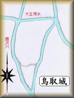 鳥取城は、大正用水と、藤沢川など2つの河川に囲まれた島状の部分に築かれていた。