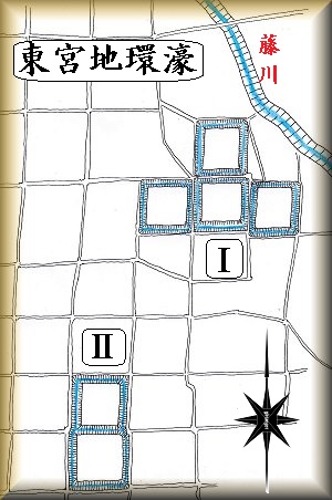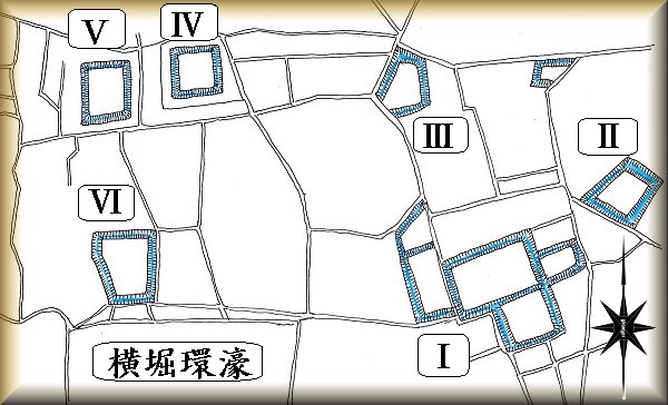 方50mほどの水堀に囲まれた区画が多数存在していたようである。こちらも集落個々の民家が周囲を堀で囲むことにより、宅地防衛と水利権とを掌握することを目的としていたものだと思われる。