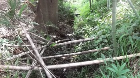 ところが、航空写真を見てみると、いかにも何か残っていそうな竹林が見えている。ということで、真夏だというのに、このヤブの中に突入してみた。だが、結果は・・・ただの竹ヤブであった。場所がずれているのであろうか。