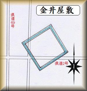 金井屋敷は、県道2号線と69号線とが交差する金井交差点の東200mほどのところにあった。現在の県道2号線と45度の角度で交差するような位置にあり、屋敷の南辺近くを県道2号線が貫通している。