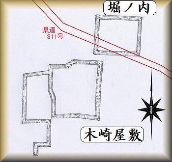 木崎城は、木崎小学校の北西600mほどの所にあった。しかし、宅地化が進んでしまったせいか、湮滅状態にある。そこで山崎一氏の図と古い航空写真を基に想像してみたのが右の図である。2郭構造の城館であったらしい。また、北東側には方形の堀ノ内区画もあり、こちらは現在、県道311号線に南西辺を削られている。
