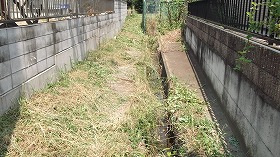| 広瀬屋敷西側の水堀。この脇に案内板が立てられている。 | 広瀬屋敷西側の内堀。堀というよりも溝のようなものである。 |