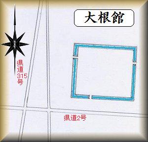 大根館は、県道2号と315号とが交差する大根の信号の北東200mほどのところにあった。しかし、御多分に漏れず宅地化によって遺構は湮滅状態にある。そこで山崎一氏の図と古い航空写真を基に描いたのが右の図である。方100mほどの居館であったと思われる。
