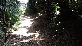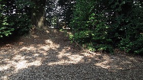 | ぼたん園北側の堀跡らしきもの。 | 本堂北側に残る土塁と堀跡。 |