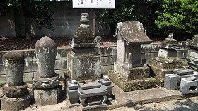 | 長慶寺の背後には土塁の跡が見られる。 | 墓地内にある長慶天皇の墓と、千利休先祖の墓。 |