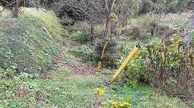 | 台地南端部のヤブの中に城址が埋もれている。鉄塔の右手奥である。 | わずかに残る土塁。 |