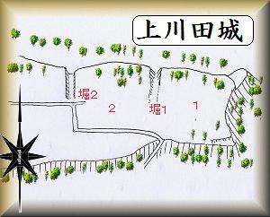 上川田城の現状はこのような状態であり、遺構の残存状況はかなりよくない。しかし、かすかに残存する遺構のイメージからすると、台地を掘り切る2本の堀によって区画された2連郭構造の城館だったように見える。ただし、『城郭体系』の記述では「3郭構造」とあるので、さらに失われた堀がもう1本あったのかもしれない。