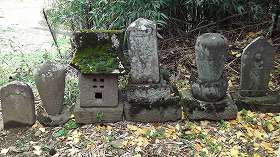 | 東側下から見た川田城。それほど高い台地ではなく、あまり要害性は感じられない。 | 先端部のお堂脇にある加沢平次左衛門の墓。『加沢記』の作者であり、晩年はこの地に隠棲していた。 |