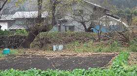 公民館に車を停めて歩いていくと、民家の庭先に「川田城」の案内が見えてくる。ということは、この辺りがすでに城の中心部近くであるということだ。この辺には民家が建てこんでしまっており、遺構を探すためには庭先に進入しなければならない。この様子では湮滅してしまっている可能性が高いと思われるが、もし遺構が残存しているにしても、民家の奥に入って行かなければ確認は難しい。