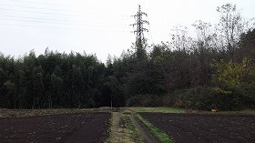 台地上は広大な畑地となっており、先端周辺が山林化していることもあり、一見してどこが台地南端部にあたるのかがよく分からない。たまたま畑作をしていた現地の方に道坂城のことを伺ってみると、その方は城址の伝承についてご存知のようで、「それなら、あの鉄塔の右手の奥の方じゃないかな」と教えてくださった。そこで、鉄塔の右側を目指して行ってみる。