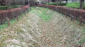 | 2郭の堀。だいぶ埋まっているが、なんとなく形状は分かる。 | 1郭の堀はほとんど埋められてしまっており、北端部付近にしか残存していない。 |