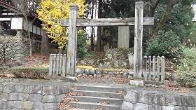 | 神社周囲を流れている水路もかつての堀の跡であろう。 | 神社入口にある冠木門。 |