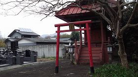 | 南側から城のあった台地を遠望した所。 | 城址にある稲荷神社j。 |