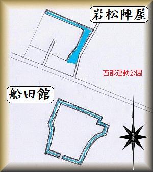 西部運動公園の西側が岩松陣屋の跡で、現在も水堀の跡が残されている。また、その東南200mほどの所に船田館があった。高遠には広い駐車場があるので、ここに車を停めさせていただいて散策するのがよいであろう。
