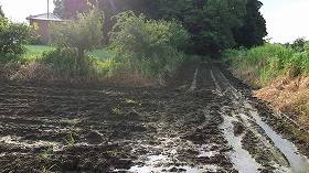 | 岩松陣屋の堀の跡。水田となっている。 | 船田館の堀跡らしく見える地形であるが、実際の所、どうなのかよく分からない。 |