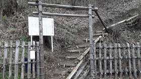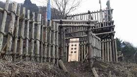 | 国道沿いの入口。チープな感じであるが、往時もこの程度のものであったかと思うと妙にリアルだったりする。 | 曲輪入口の柵と門。2016大河ドラマ『真田丸』にちなんでか、六文銭の楯が置いてある。 |