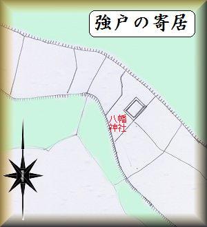 強戸の八幡神社の北西側一帯が、強戸の寄居である。寄居は城郭関連地名であるから、ここに城館が営まれていた可能性は高い。山崎一氏の図を見ると、方形の区画が存在していたようである。