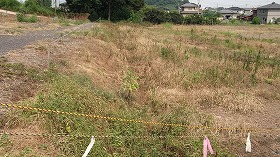 環濠Tは、延命寺の北東300mほどの所にある。宅地化されていて遺構はなさそうだが、西側には、堀としても利用されたであろう水路が通っている。しかし、帰宅してから航空写真を見ると、民家の背後に山林があるのが確認できた。おそらくこの中に、土塁や堀が残されているのではないだろうか。