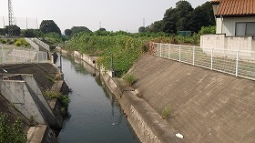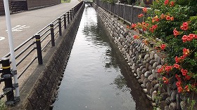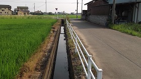 | 延命寺の東側の沖野環濠Uには現在も水堀がよく残っている。 | 沖野環濠Vの脇の水路。 |