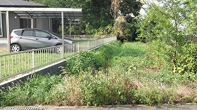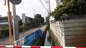 | 萩原城北側の堀跡。溝のようになっている。 | 西側を流れる水路。 |